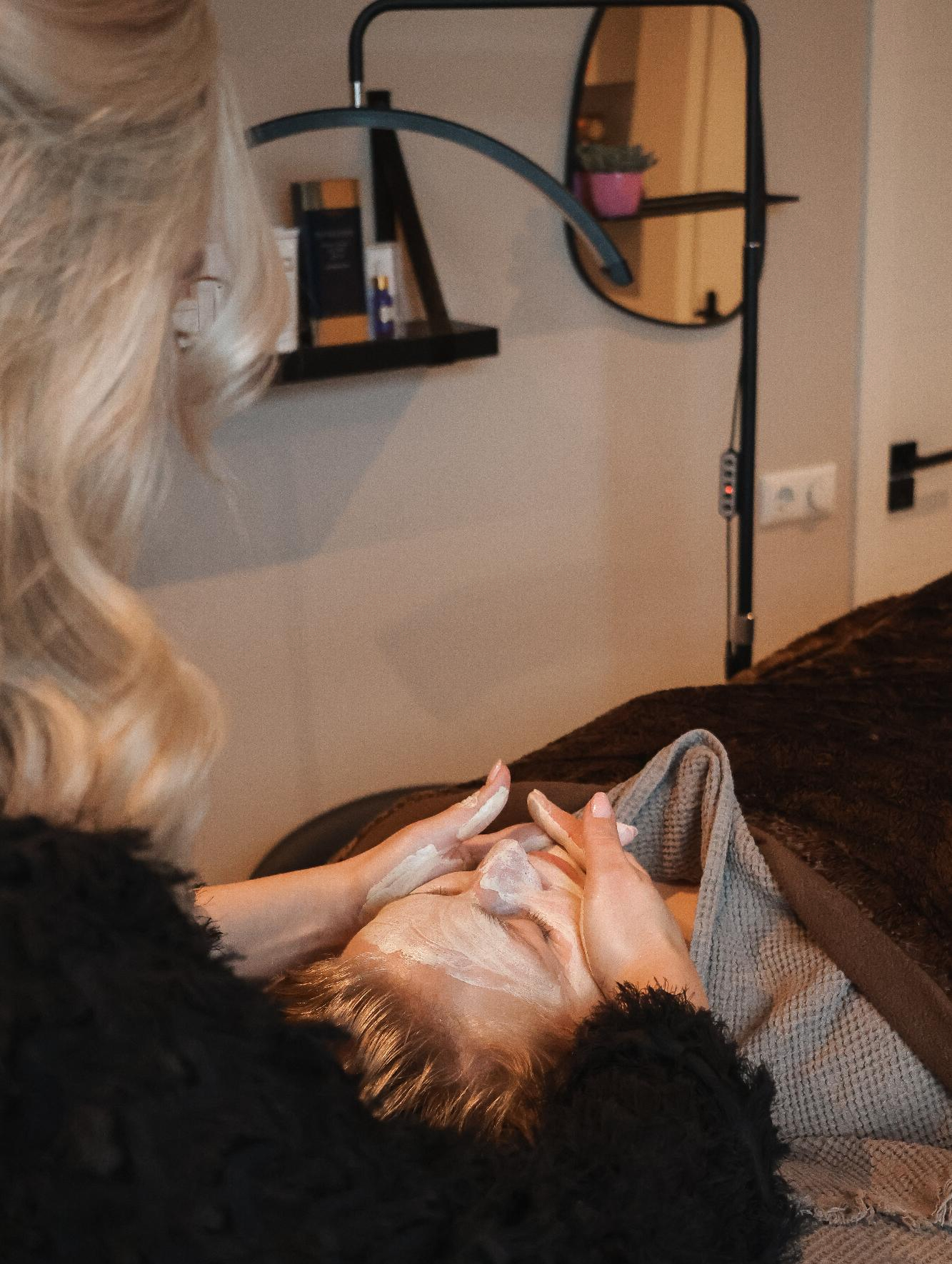 epileren – reinigen – deep clean – ontgiftend masker – nano serum – serum vitamine C – massage vitamine E – hoofdhuid massage – hyaluron vliesmasker – oog + gezichtscrème.